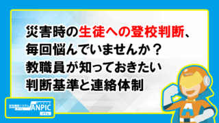 判断基準 学校 災害時の生徒への登校判断、毎回悩んでいませんか?|教職員が知っておきたい判断基準と連絡体制 地震や台風などの災害が発生したとき、児童・生徒を登校させるべきかどうか。この判断は、学校にとって非常に大きな責任を伴いま... 2025.09.12 判断基準 学校